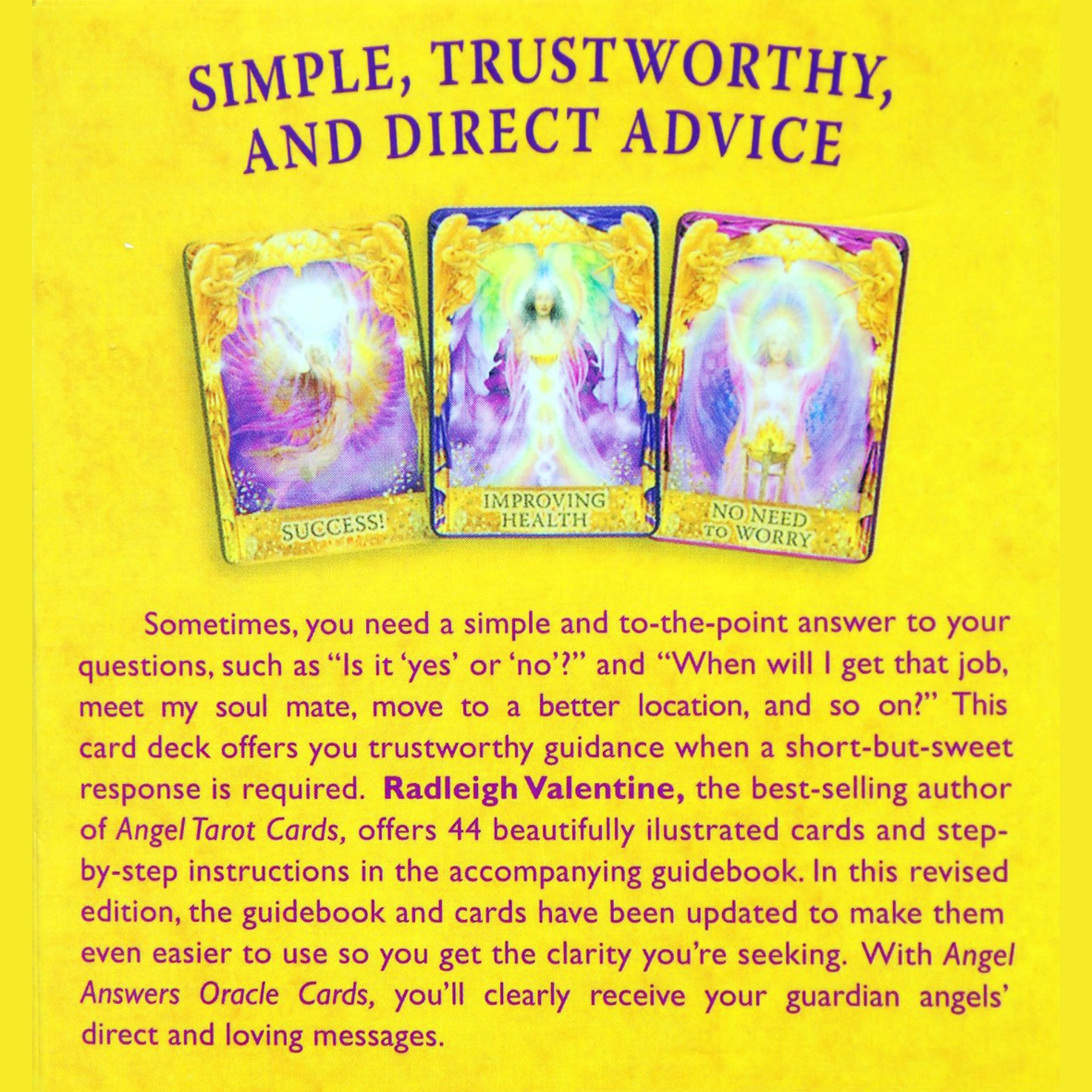 Išdėlioti šias korteles reiškia gauti paprastą, patikimą ir aiškų patarimą iš savo angelų. Kartais jums reikia paprasto ir konkretaus atsakymo į jūsų klausimus, pvz., „Taip arba ne. Ši kortų kaladė suteikia patikimų patarimų, kai reikia trumpo, bet saldaus atsakymo.
