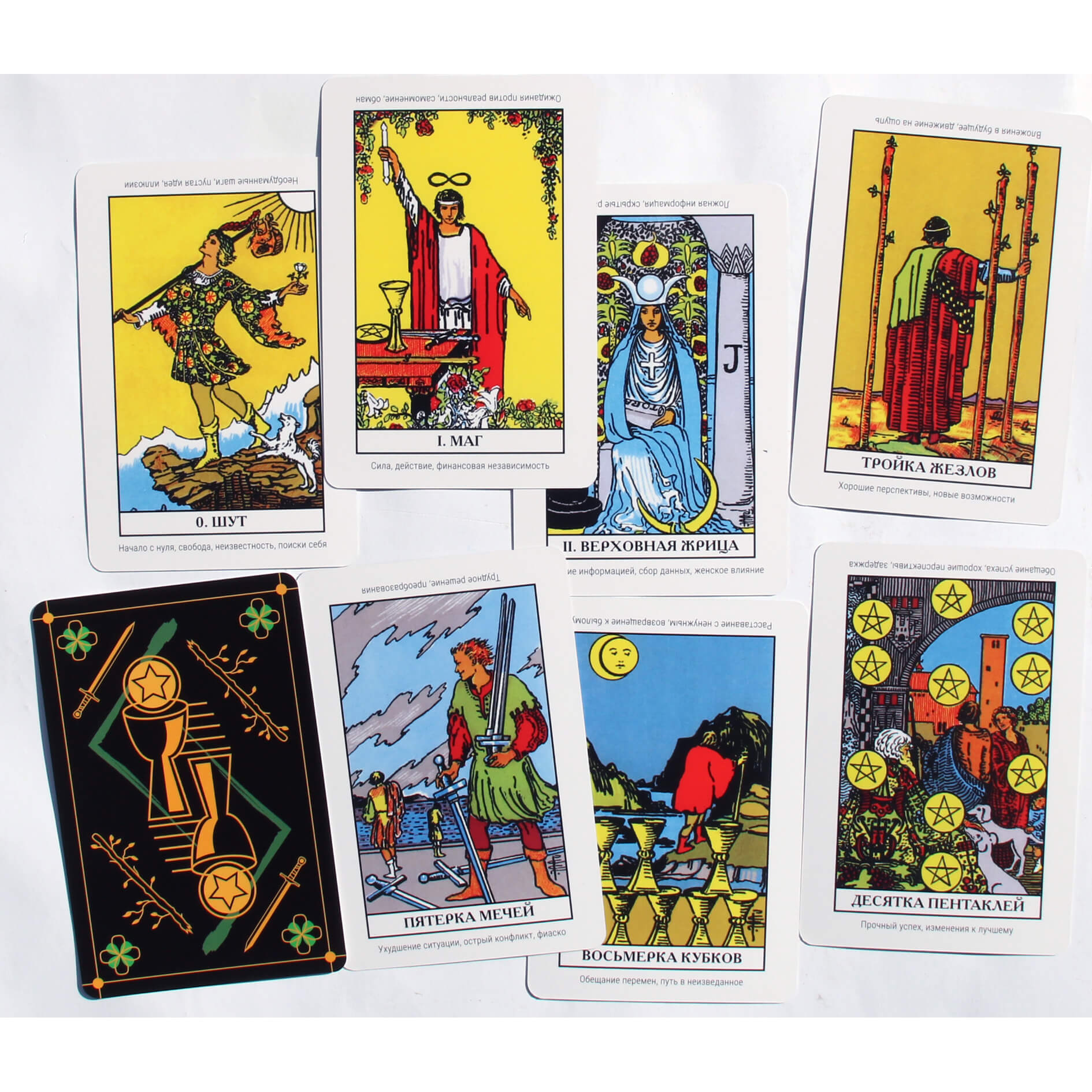 Колода основана на самой популярной в мире классической системе Уэйта-Смит. На каждой карте указаны прямые и перевернутые значения, которые направят ваши мысли в нужном направлении и помогут найти ответ. Такой колодой сможет воспользоваться даже ученик, который еще не разобрался с символикой. У карт уникальная и символичная рубашка. Здесь переплетаются четырехлистный клевер, руна Йера и знакомые масти Таро. Такое сочетание настраивает вас на нужную волну и помогает лучше анализировать себя и ситуацию в материальной сфере.