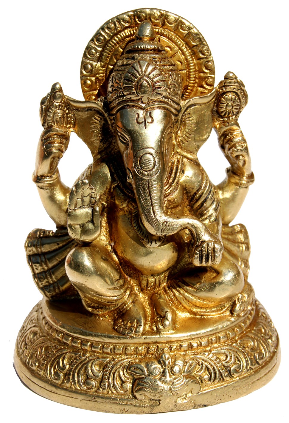 Эта бронзовая статуэтка изображает Ганешу, бога мудрости, благополучия и устранения препятствий. На его лбу изображён трезубец, символизирующий триединство созидания, сохранения и разрушения. Четыре руки Ганеши держат традиционные атрибуты: