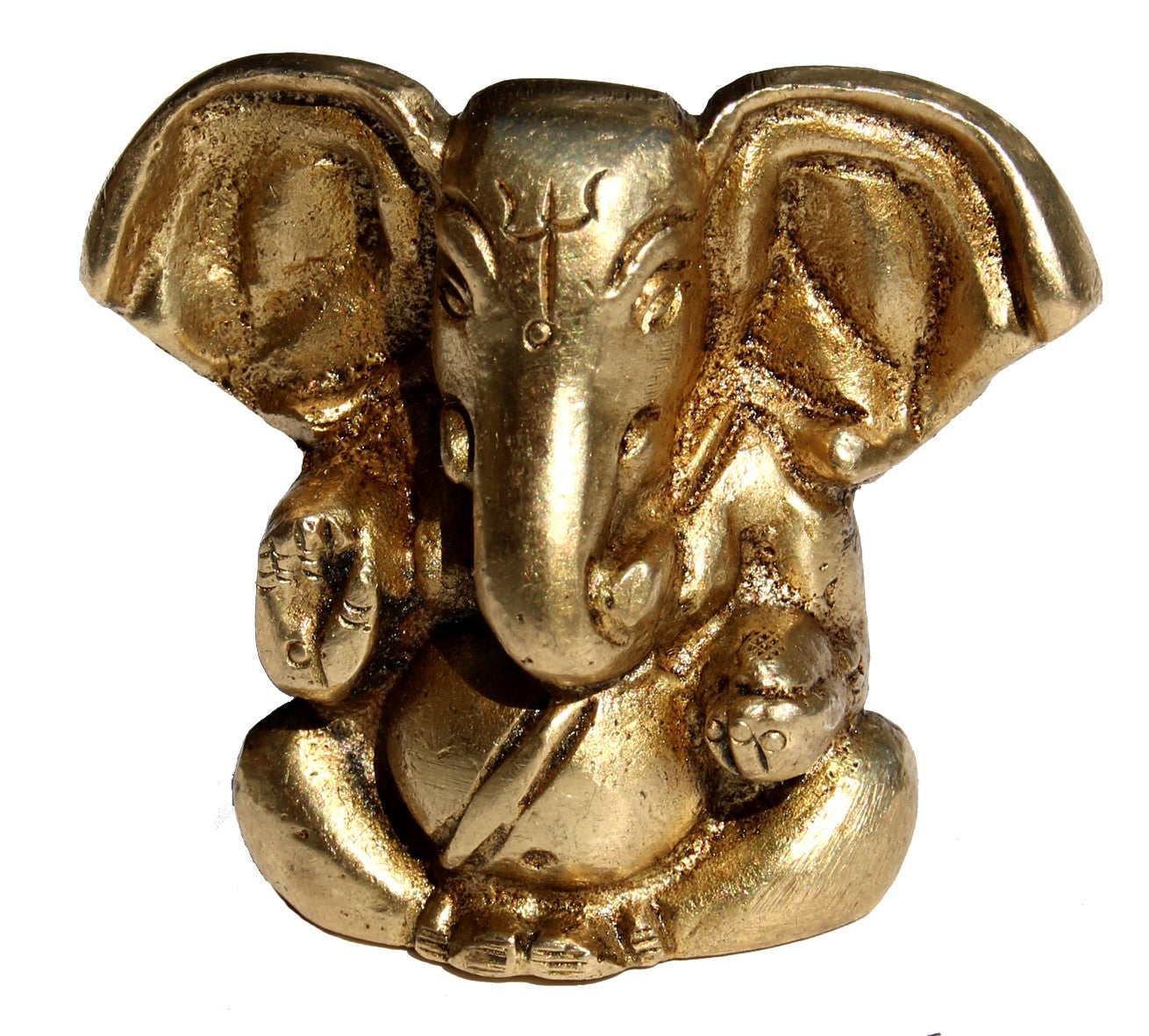 Эта бронзовая статуэтка изображает Ганешу, бога мудрости, благополучия и устранения препятствий. На его лбу изображён трезубец, символизирующий триединство созидания, сохранения и разрушения. Правая рука сложена в жест благословения, который дарует защиту и успех, а левая держит сладость (модак), символизирующую духовное удовлетворение и внутреннее блаженство.