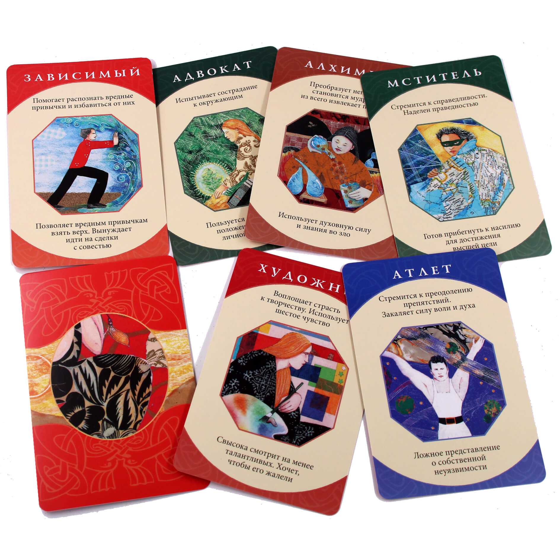 Автор колоды, Кэролайн Мисс, определила 74 наиболее распространенных архетипа, которые встречаются у людей уже многие сотни лет. Каждая карта — это верный защитник и ключик к осознанию вашего внутреннего "я". Вместе с ними вы лучше поймете себя и научитесь справляться с негативными чертами некоторых архетипов.