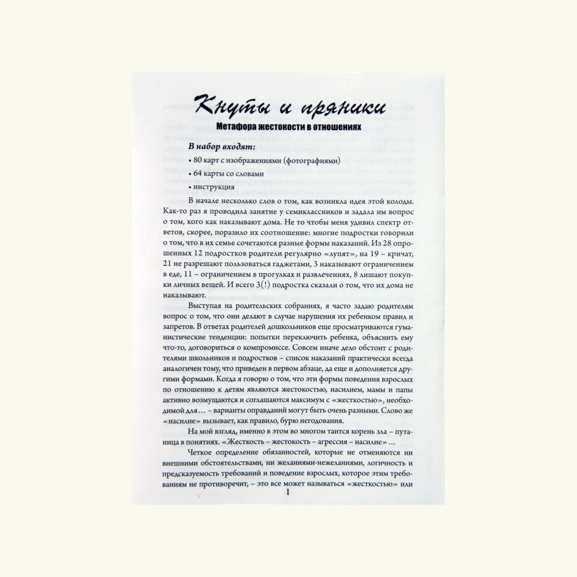 Кнуты и пряники – это колода про воспитание, ограничения, наказания, подавление, про чувства, ресурсы и опоры, про детско-родительские отношения и отношения с окружающими. Колода создавалась как инструмент работы, в первую очередь, именно с детьми – жертвами разных форм жестокого обращения в семье. Речь идет обо всех формах жестокого обращения, включая физическое, психологическое, сексуальное насилие и пренебрежение нуждами ребенка. Колода дает возможность ребенку отреагировать, вывести вовне сложные эмоциональные переживания, найти точки опоры для дальнейшей жизни и ресурсы для преодоления травматических событий. Жестокое обращение с детьми – дело не только семейное. Дети становятся жертвами и в школе, и во дворе, и в других (порой абсолютно непредсказуемых) условиях.