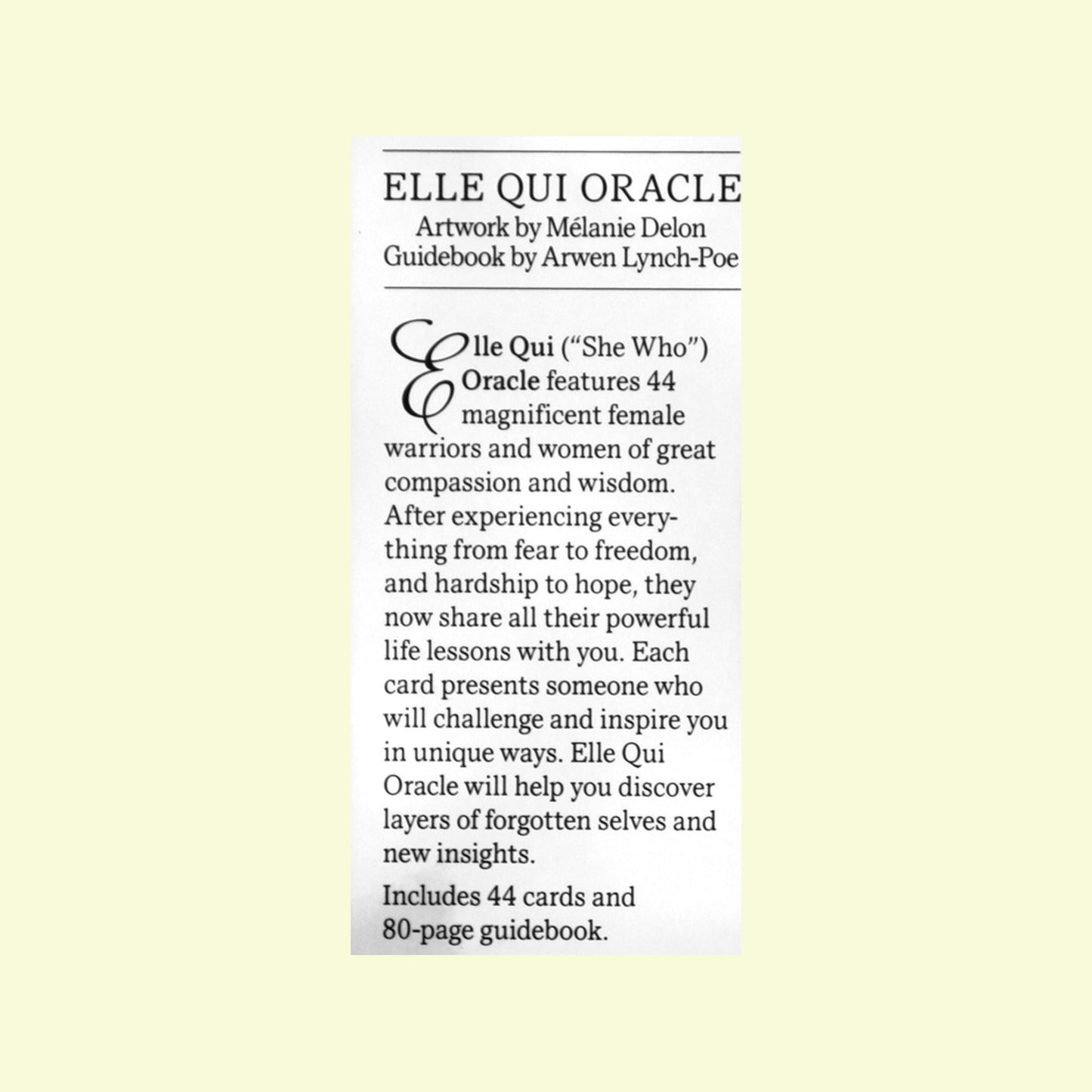 В оракуле Elle Qui (в перводе с французского что-то вроде «Та, которая») вас ждут 44 женщины-воина, носительницы мудрости и сострадания. Пережив все, от страха до свободы и от невзгод до надежды, они теперь делятся с вами всеми своими мощными жизненными уроками. Каждая карта представляет кого-то, кто бросит вызов и придаст силы для вдохновения.