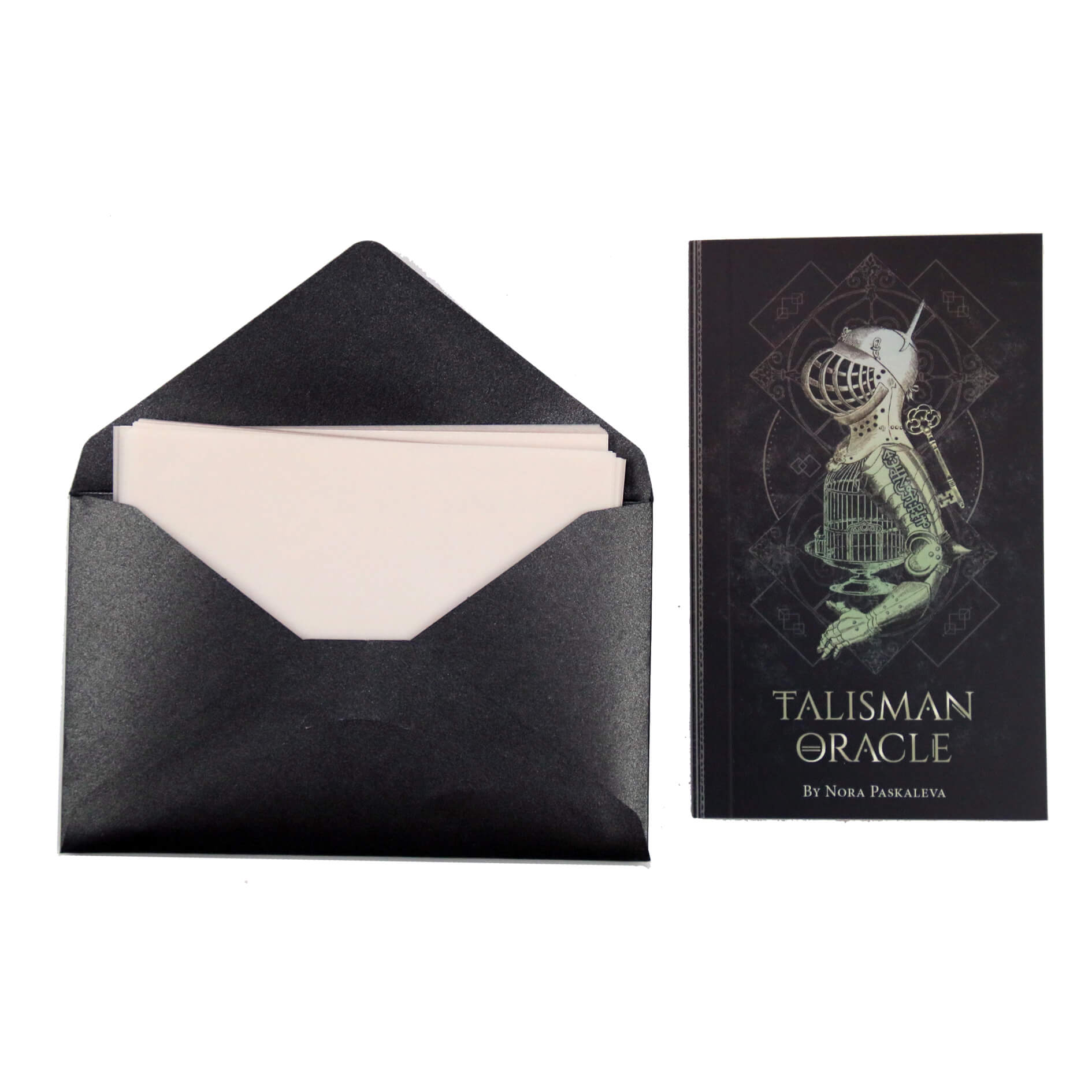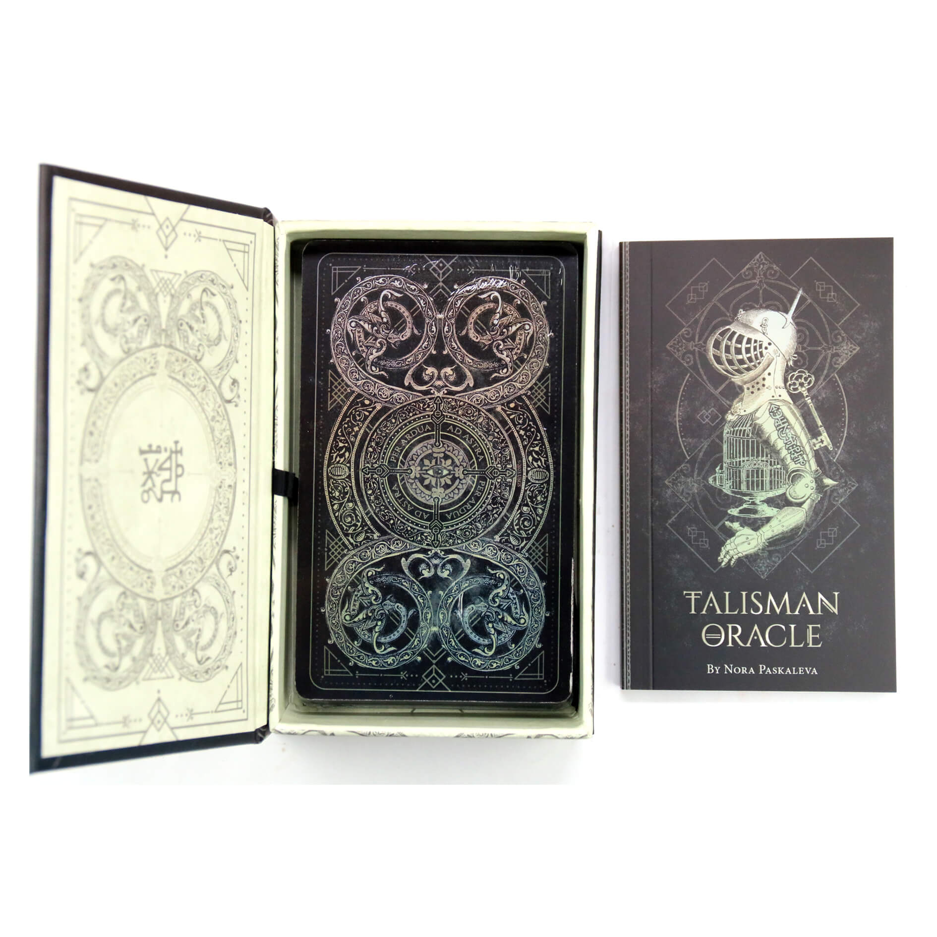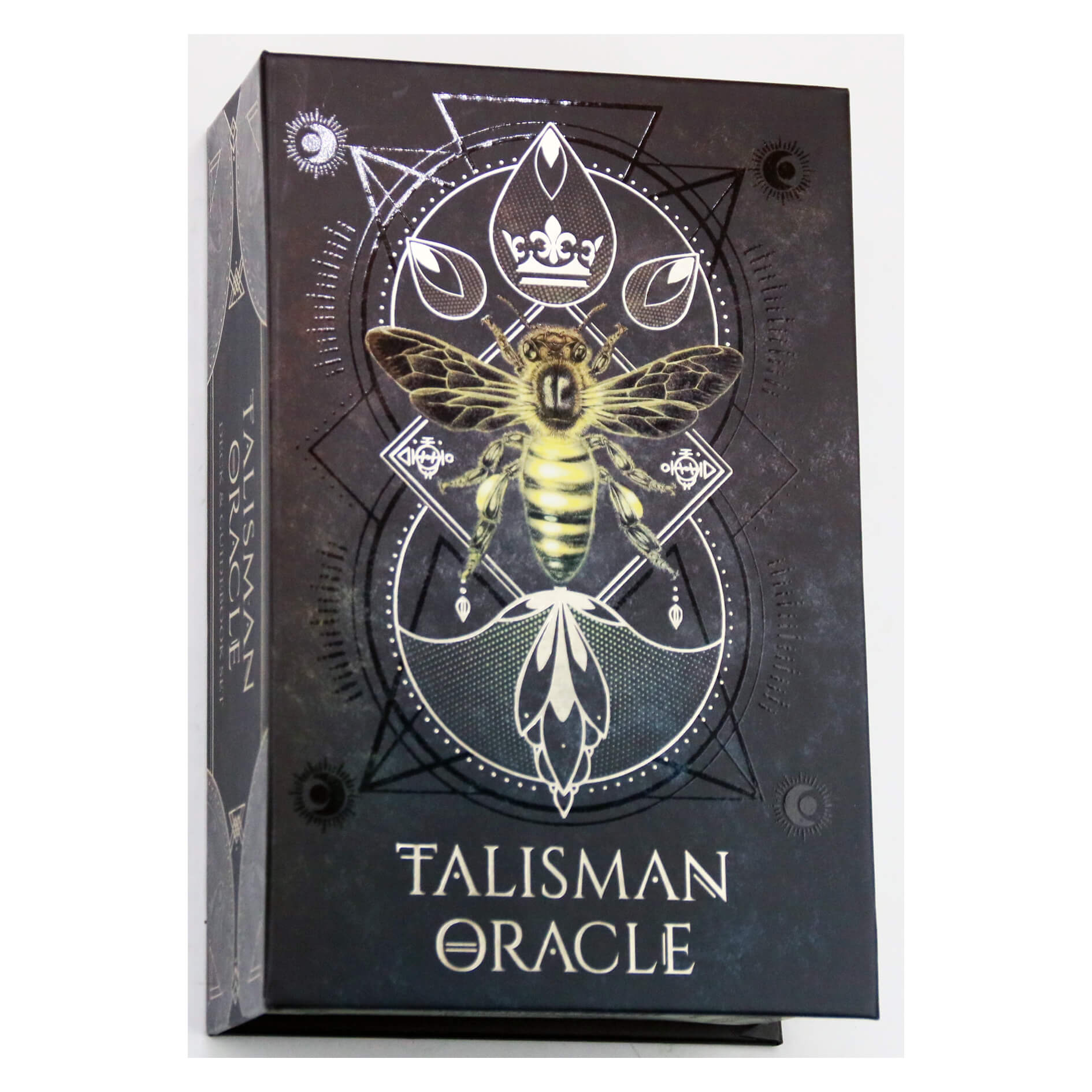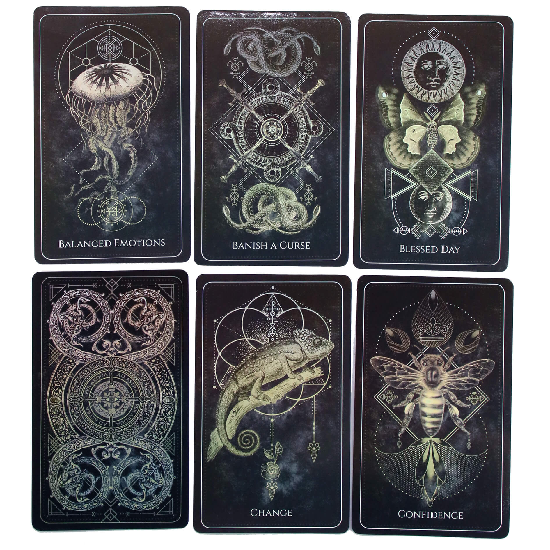 Этот очаровательный набор включает в себя 44 черные карты с позолоченным срезом, украшенные магическими символами и сакральной геометрией, пачку из 44 листов веленевой кальки и иллюстрированную 112-страничную инструкцию на английском языке. Упакован в лакированную коробку с тиснением фольгой.