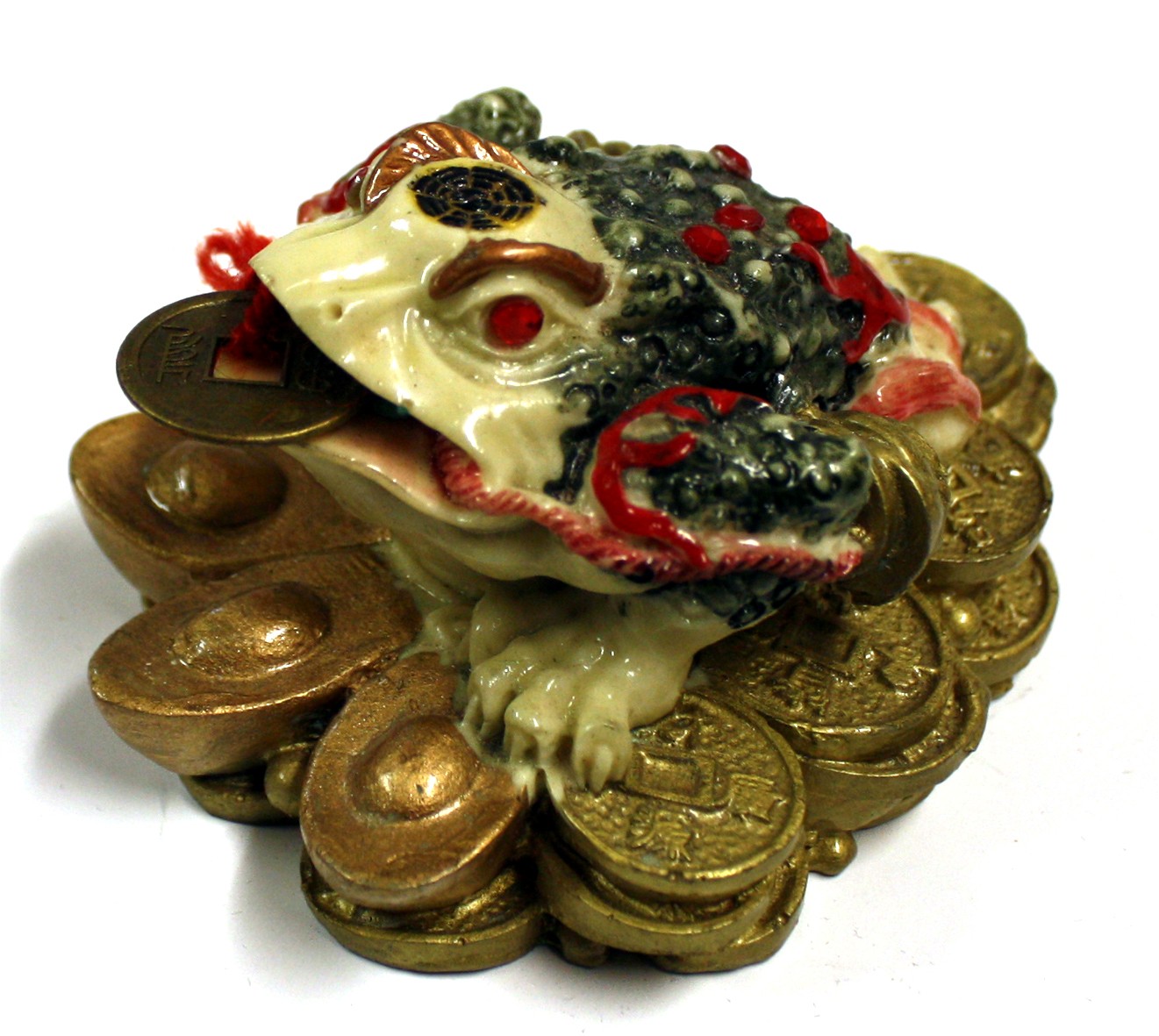 Согласно древней легенде, жаба фэн шуй с монеткой во рту отрабатывает тот урок, который за жадность и зловредность преподал ей мудрый Будда. Теперь злокозненная в прошлом жаба вечно должна помогать людям и приносить им деньги, выплевывая золотые монетки.