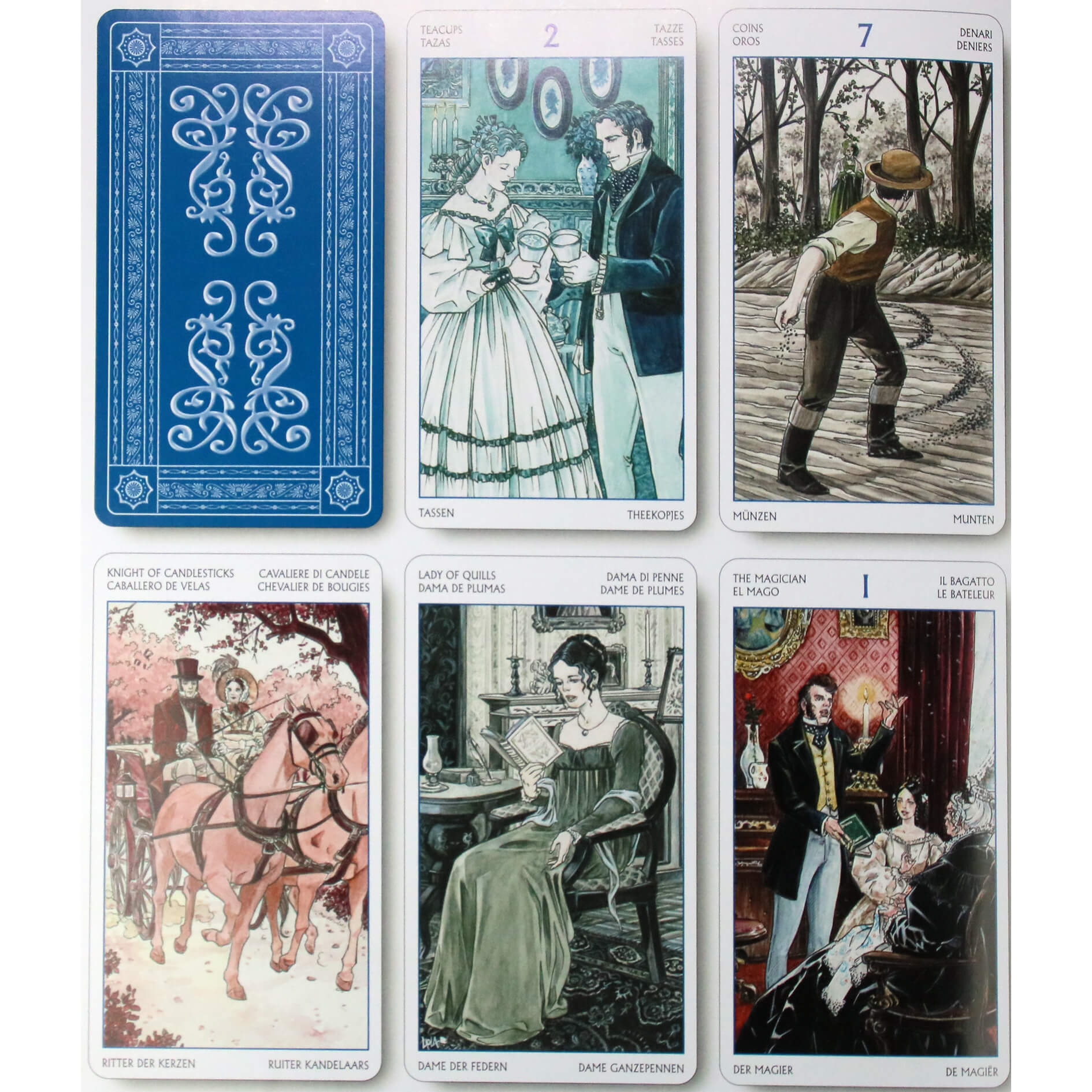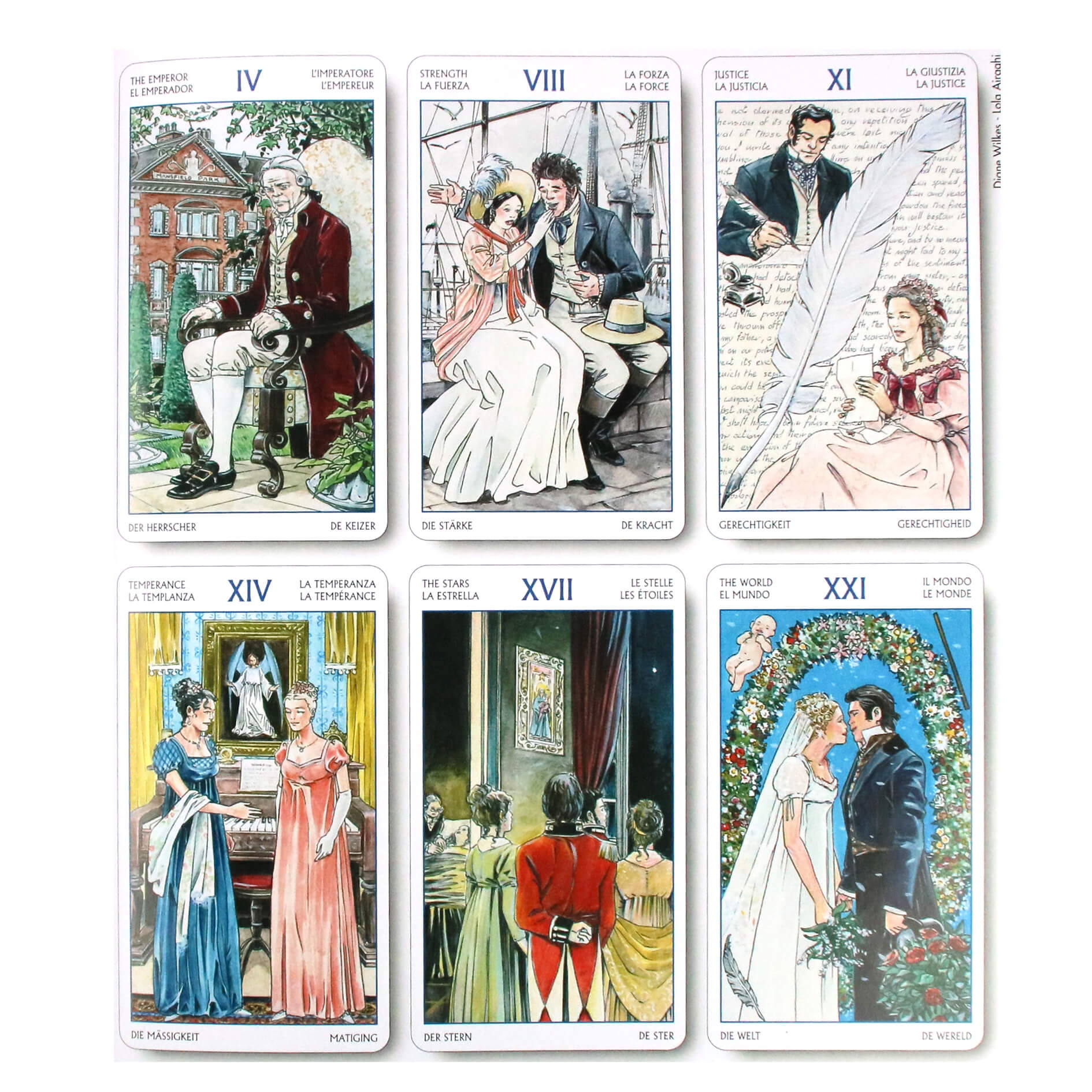 Колода проиллюстрирована по мотивам произведений Джейн Остин «Гордость и предубеждение», «Эмма», «Разум и чувства». Прекрасное сочетание карт Таро и любимых персонажей из классических романов Джейн Остин. Брак - основная тема в этой колоде Таро.