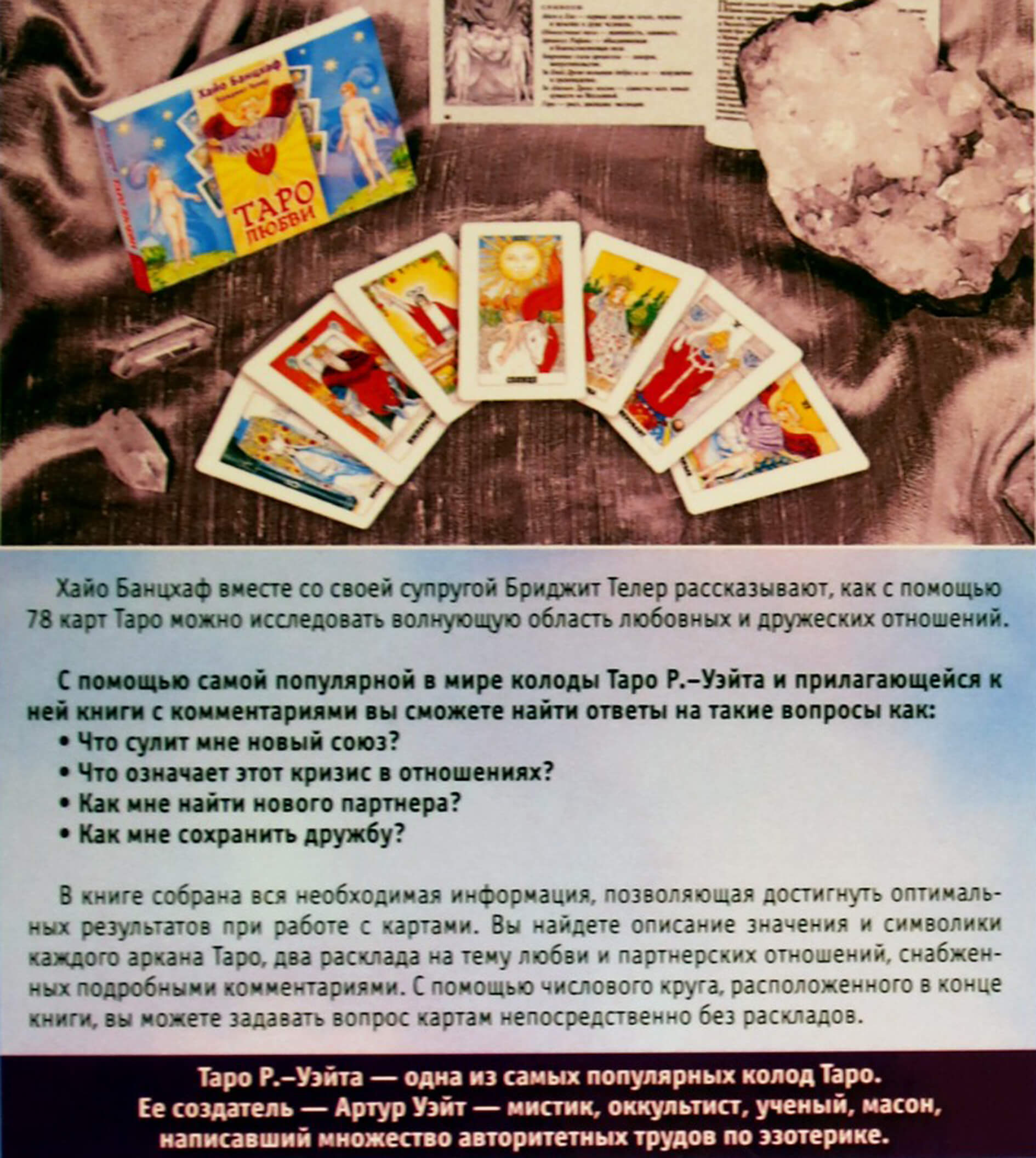 Бриджит Телер - специалист в области Таро, астрологии и психологии, супруга известного таролога Хайо Банцхафа рассказывает как с помощью 78 карт Таро можно исследовать волнующую область любовных и дружеских отношений.